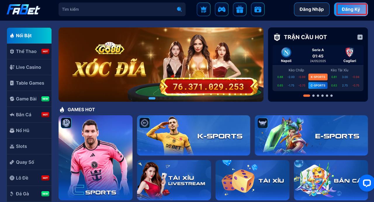 Đầu tiên, mở trình duyệt và truy cập trang chủ Fabet qua link uy tín. Tại góc trên bên phải màn hình, bạn sẽ thấy nút “Đăng ký” nổi bật, hãy click vào đó để mở form đăng ký.