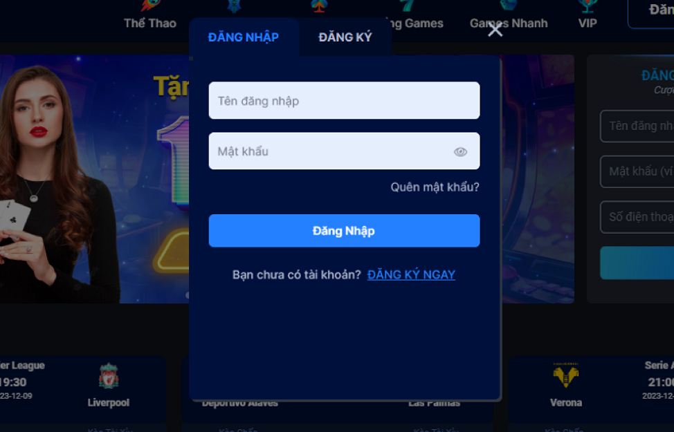 Truy cập trang chủ hoặc mở app, nhập tên đăng nhập và mật khẩu đã tạo lúc đăng ký. Nhấn “Đăng nhập” để vào giao diện chính với đầy đủ tính năng cá cược.
